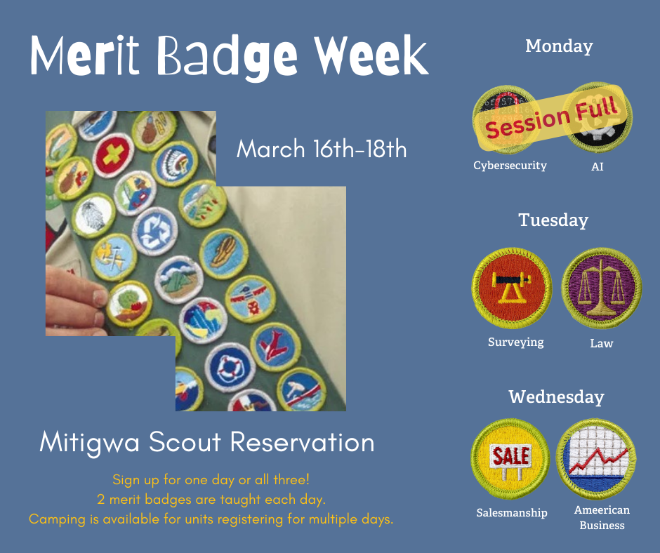 Our second annual Mitigwa Merit Badge Days is open for registrations! We are changing it up a little this year and spreading the fun and learning over three days. Each day will feature two merit badges. One will be taught in the morning and a second in the afternoon. Our Monday session is FULL! Sign up for our waitlist if you would like to attend the Tuesday and/or Wednesday session.